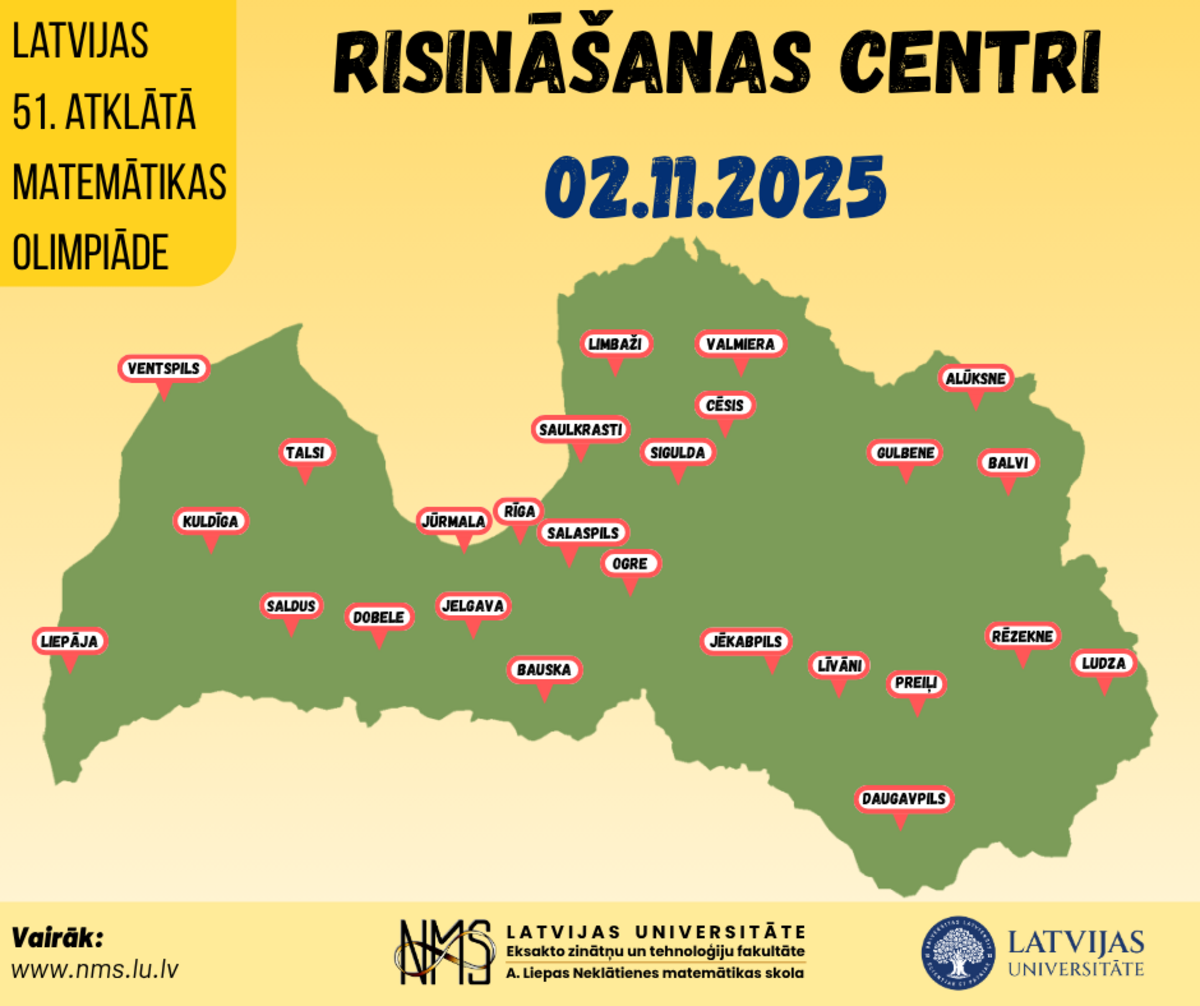 Atklātā matemātikas olimpiāde notiks 2025. gada 2. novembrī (svētdienā) klātienē vairākās Latvijas pilsētās: Rīgā, Alūksnē, Balvos, Bauskā, Cēsīs, Daugavpilī, Dobelē, Gulbenē, Jelgavā, Jēkabpilī, Jūrmalā, Kuldīgā, Liepājā, Limbažos, Līvānos, Ludzā, Ogrē, Preiļos, Rēzeknē, Salaspilī, Saldū, Saulkrastos, Siguldā, Talsos, Valmierā un Ventspilī.