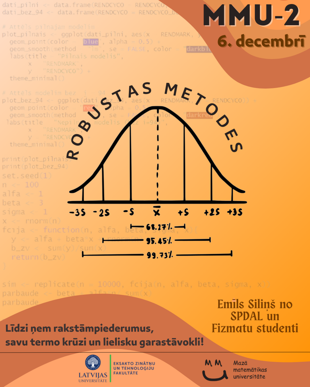Sestdien, 6. decembrī, MMU 2. nodarbības ietvaros ietvaros ar Statistisko pētījumu un datu analīzes laboratorijas darbinieku Emīlu Siliņu runāsim par Robustām metodēm un to, kāpēc tās svarīgas un nozīmīgas.