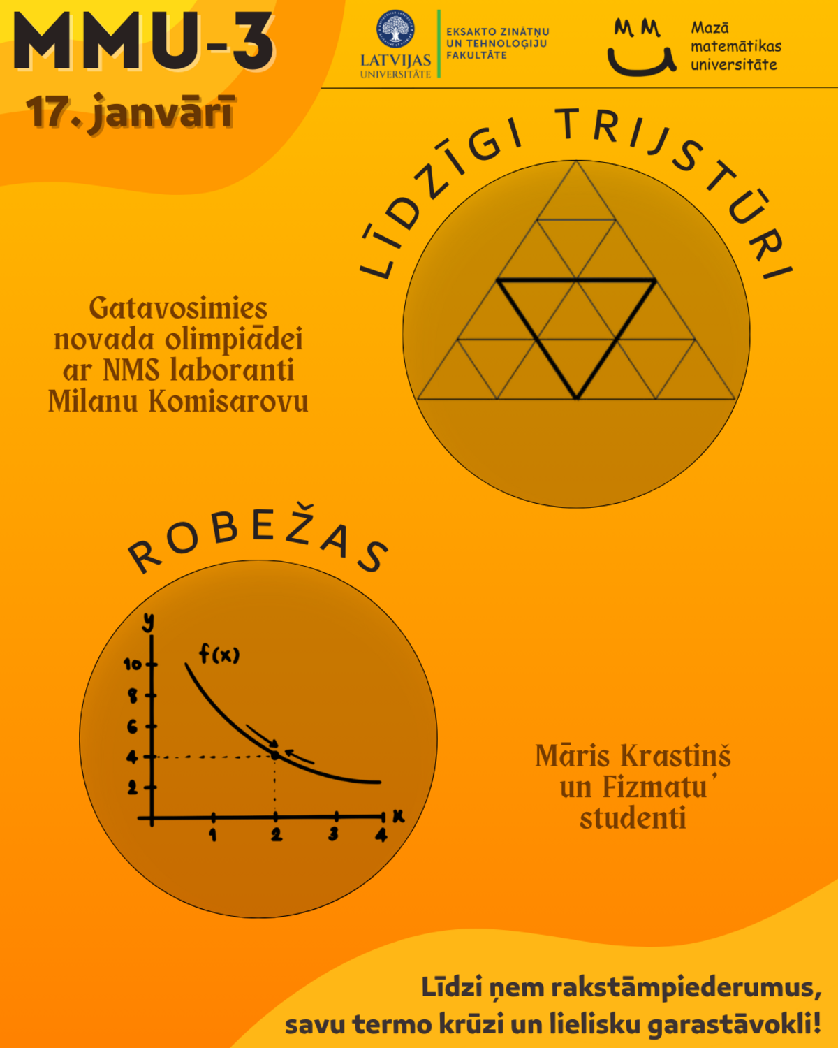Sestdien, 17. janvārī, MMU 3. nodarbības ietvaros ietvaros ar A. Liepas Neklātienes matemātikas skolas laboranti Milanu Komisarovu gatavosimies Novada matemātikas olimpiādēi kopīgi runājot par tēmu “Līdzīgi trijstūri”, savukārt ar Matemātikas doktorantu Māri Krastiņu aplūkosim tēmu “Robežas”.