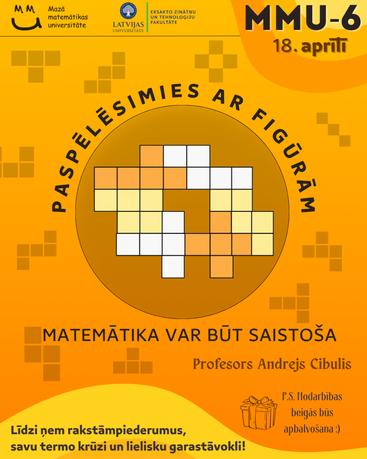 Sestdien, 18. aprīlī, norisināsies noslēdzošā MMU nodarbība šajā sezonā. MMU 6. nodarbības ietvaros ar ar profesoru un matemātisko spēļu entuziastu Andreju Cibuli un Matemātikas nodaļas studentiem “paspēlēsimies” ar figūrām, savukārt noslēgumā plānota MMU apbalvošana, kuras laikā aktīvākie skolēni varēs saņemt sertifikātus un citas balvas.